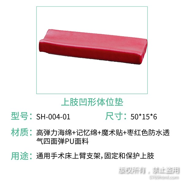 蒙泰護理凹形體位墊有上肢用凹形體位墊們也有下肢用凹形體位墊,選用棗紅色四面彈面料,防水透氣,海綿選用高彈力海綿和記憶棉組合拼接,既能做到支撐也能達到減壓效果。上肢凹形體位墊通用于手術(shù)床上臂支架,固定和保護上肢。下肢凹形體位墊俯臥位時支撐保護膝關(guān)節(jié)。