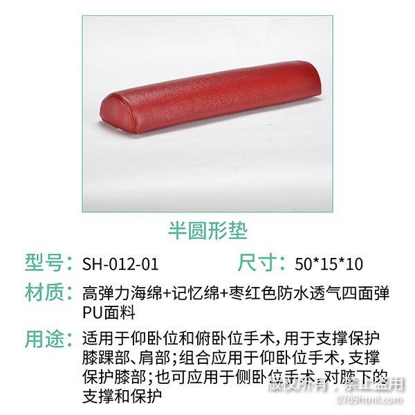 海綿體位墊系列中的半圓形墊,適用于仰臥位和俯臥位手術(shù),常用于支撐保護(hù)膝踝部、肩部、組合應(yīng)用于仰臥位手術(shù),支撐保護(hù)胸部和髖部;也可用于側(cè)臥位手術(shù)等,對(duì)腋下的支撐和保護(hù)。而且半圓形墊是手術(shù)室護(hù)理中較常用到的體位墊之一,常規(guī)尺寸為50*15*10,如果這個(gè)尺寸與您所找的尺寸不符合,也是可以進(jìn)行定制服務(wù)
