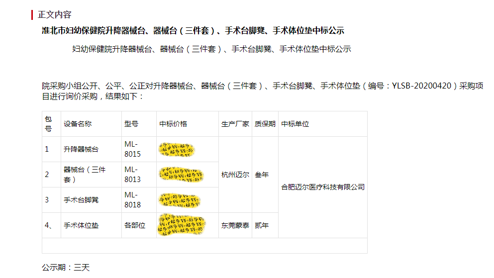 淮北市婦幼保健院手術(shù)體位墊中標后進院清單