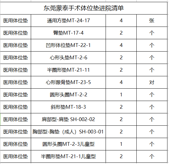 中標后,由于疫情的影響,手術(shù)體位墊的款式遲遲沒有確定下來,一直到11月份,終于確定了部份款式先進院使用,清單如下:
